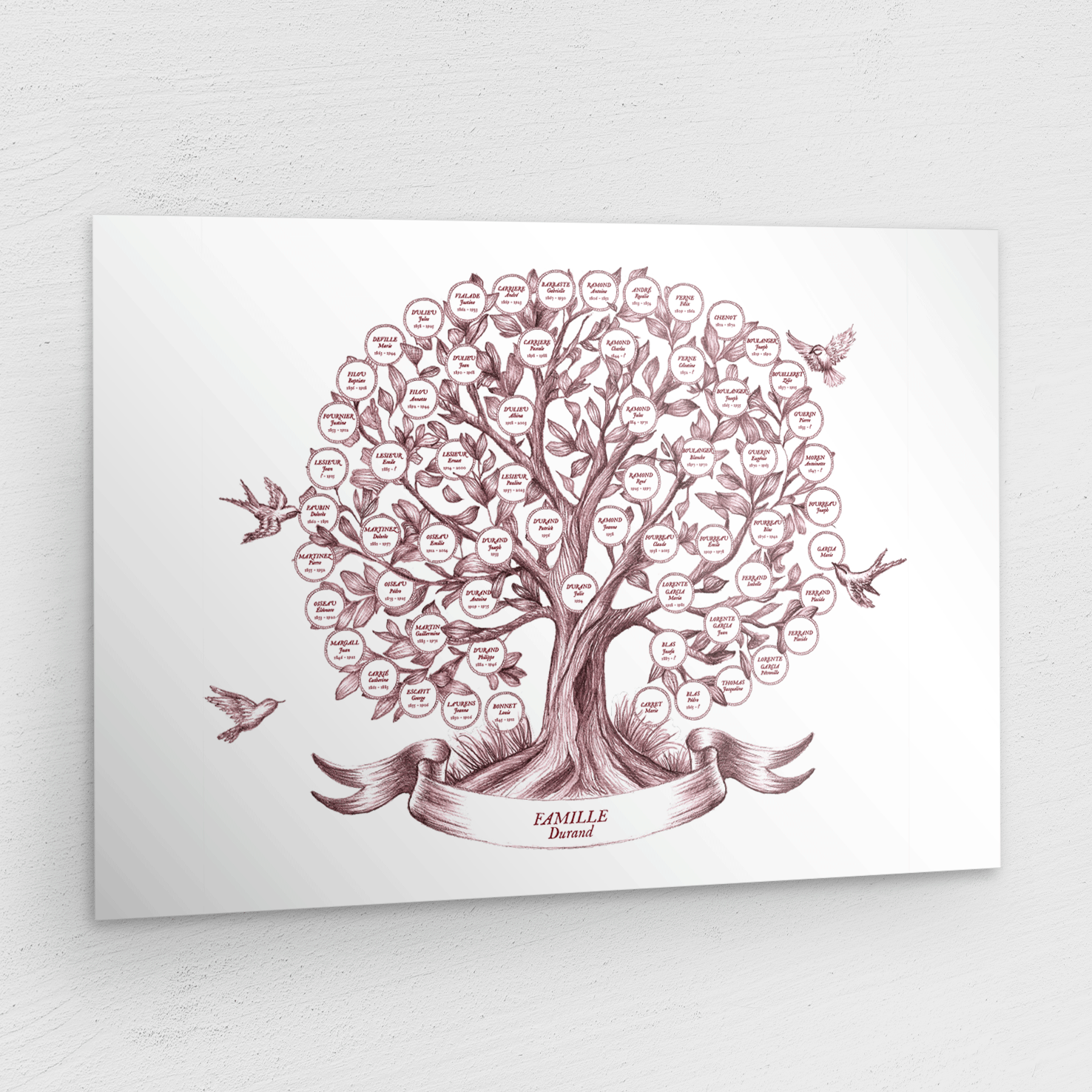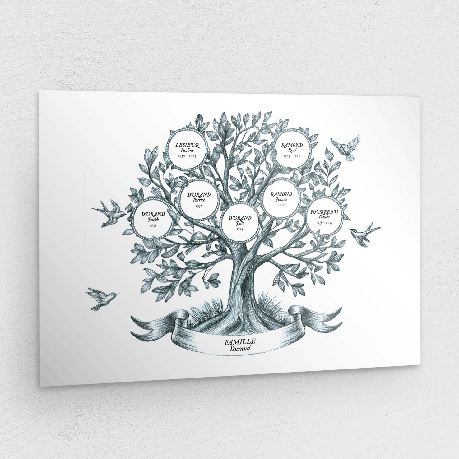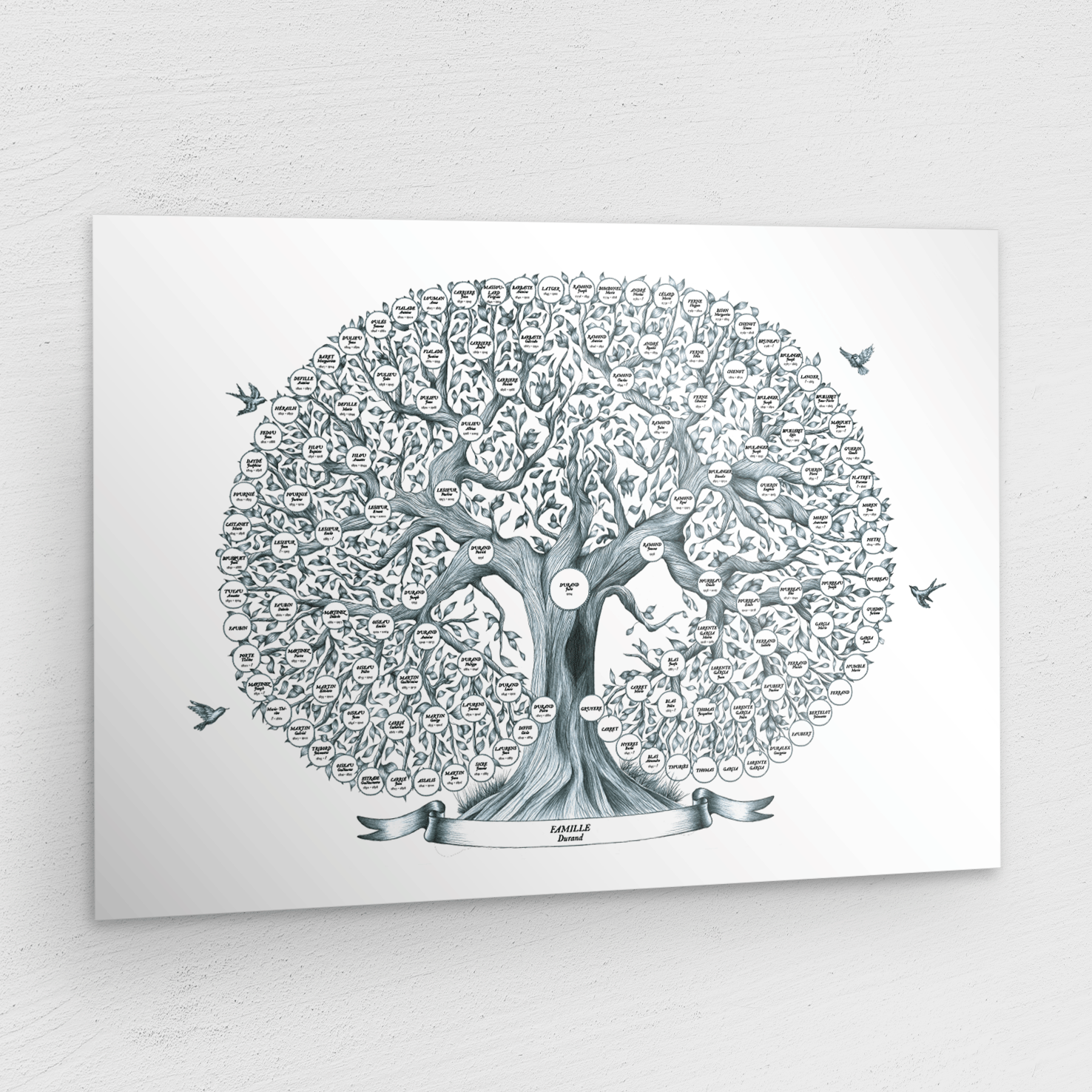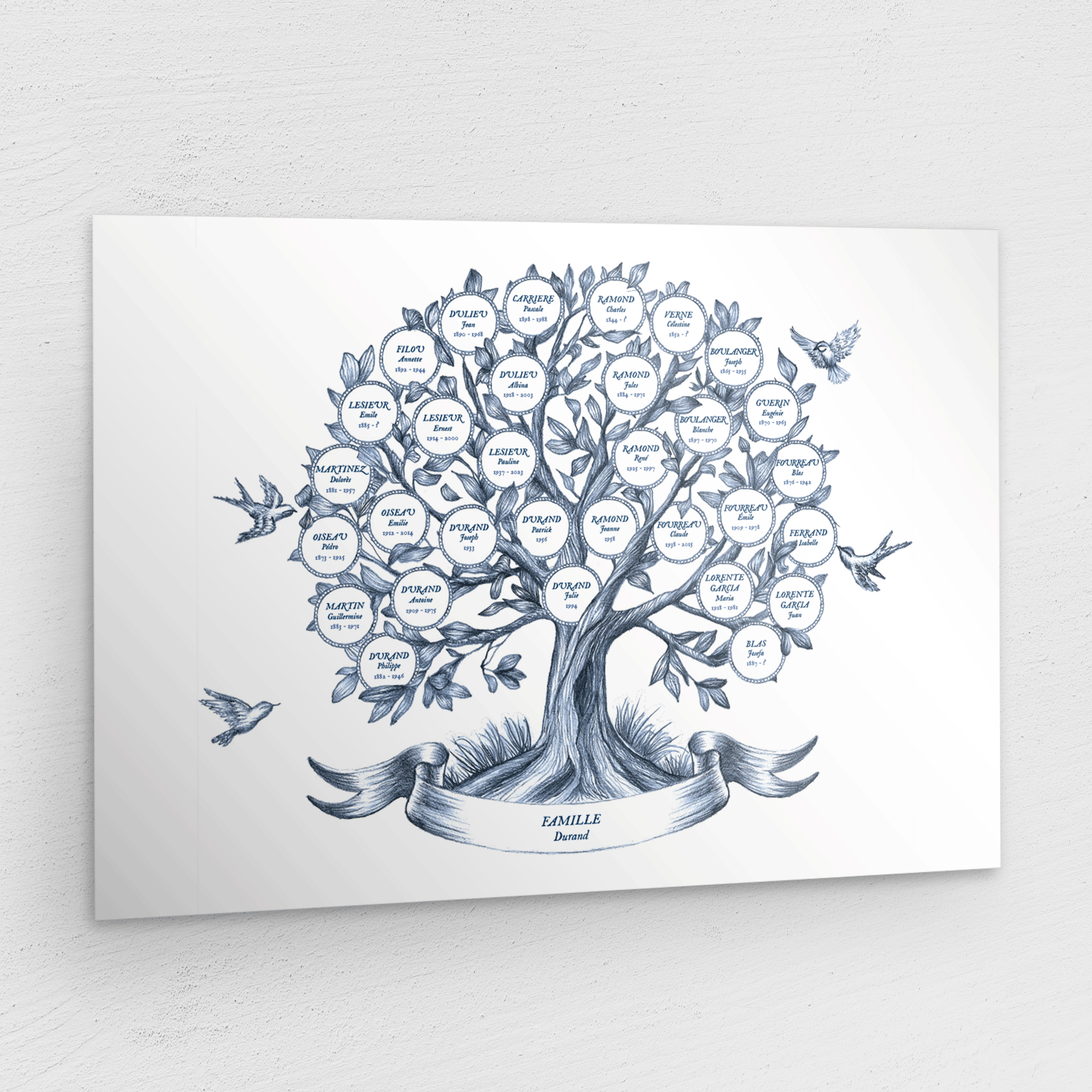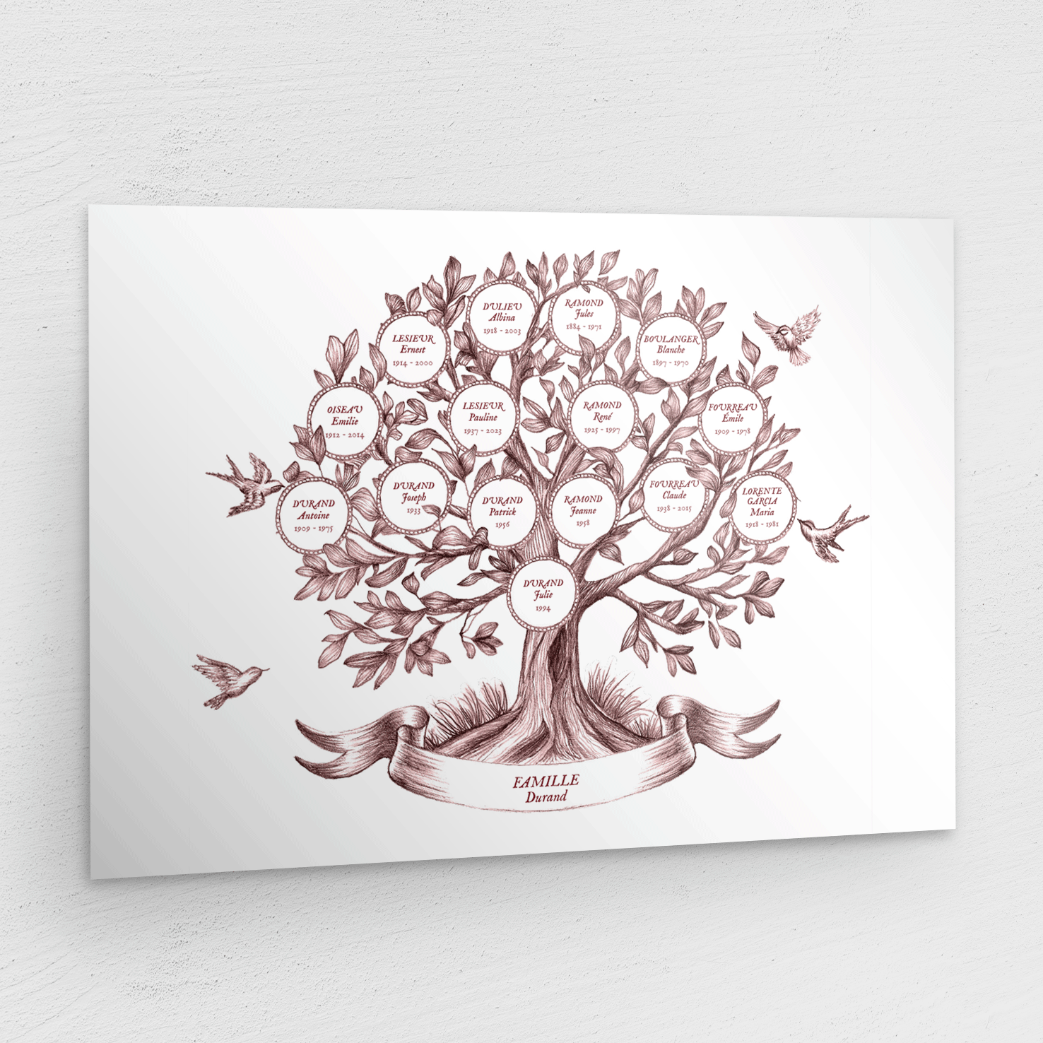 Immortalisez votre histoire familiale avec cet arbre généalogique unique, délicatement dessiné à la main, numérisé en haute qualité et imprimé sur papier brillant ou mat selon vos envies. D’inspiration classique, chaque détail a été pensé pour mettre en valeur vos racines et l’héritage de votre famille. Disponible du format A4 au format A1, il peut représenter de 3 à 7 générations selon vos besoins et se décline en 3 coloris.